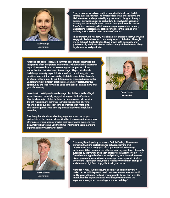 We are committed to providing you with a range of opportunities to connect and get to know us, while taking the time to get to know you. Follow Buddle Findlay on Instagram (@buddle_findlay) to stay connected and be notified of key dates and events in the future. Come and say hello to us when we visit your campus (whether that is virtually or in person).